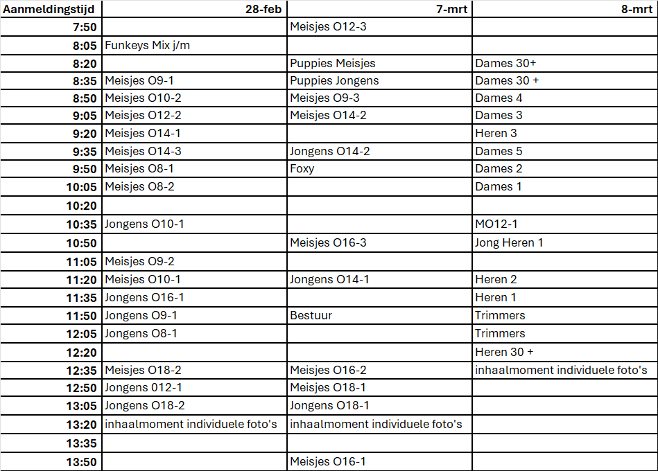 De fotomomenten staan gepland op 28 februari, 7 en 8 maart. De planning hiervoor wordt momenteel gemaakt. Houd LISA en de teamapps goed in de gaten zodat je niets mist. We proberen zoveel mogelijk rekening te houden met de wedstrijdschema's.